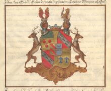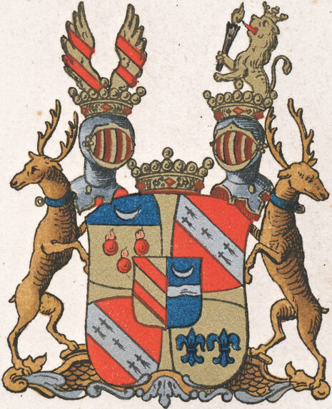”… En med ett utbögt Kors af Guld fyrdelad Swensk Skiöld, mitt uppå belagd med en mindre Fransk Hiert Skjöld, som innefattar det förra Adeliga Stam wapnet, nämligen en mitt i Tu klufwen skiöld Hwars Högra del af Guld, är belagd med Twenne Röda Bander, men den Wänstra Blå, med en mitt igenom bielckewis flytande Ström af Silfwer, och der ofwanföre en wäxande Halfmåne as samma Metall. Af det Friherrliga Wapnet förekommer först det Öfre Högra Fäldtet, som är fördelt i Twenne delar. Den öfre delen intager en Trediedel af Fäldtet pch är grön, samt föreställer en wäxande Half Måne af Silfwer, men det öfriga Fäldtet af Guld och deruti Tre Röda brinnande Granater 2 Och 1. Stäldte. Det Andra eller Öfra Fäldtet till wänster och likaså det 3:e, och Nedra fäldtet til Höger, äro begge Röde, och öfwer Hwardera en Bande af Silfwer, beströdd med Fem Herminer äfwen Bande wis stälte 2.1.2: Det Fierde eller Nedra Fäldtet till wänster är af Guld, och deruti förekomma Tw å i bredd stående blå Franska Lilljor. Ofwan på Skjölden ses en Friherrlig Crona Emellan Twenne Wingar af Guld Hwardera belagd med Twå Röda Bander, och utur den wänstra Cronan upreser sig emot Höger till Hälften ett Krönt Leijon af Guld, som med Högra Ramen förer en brinnande Fackla af Silfwer. Skjöldhållare äro Twenne Naturligt målade raska Hiortar med utwände hufwuden och prydde med blå Guldkantade Halsband, samt wid hwardera utåt häftad en Guldring. Aldeles som samma Wapen med sina rätta och egenteliga Färgor har ofwanföre afmålat finnes.”