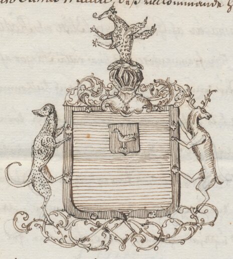 ”… och föra deras gamla Slägte wapen, som är: En Blå Skiöld, hvaruppå en mindre Röd Skiöld är lagd, och hvaruti en till höger sig Vändande Dufwa af Silfver. Kring Skiölden är en röd Bord, Zirad med åtta S:t Jacobs Musslor äfven af Silfver. Ofvan på Skiölden står en Öppen Tornerehielm, hvarutur upstiger öfre delen af en Grön krönt Drake med hvita Wingar. Sielfva Wapnet uppehålles på högra sidan af en Hund af Guld, och på den Wänstra af en Hjort med Naturlig färg. Krantsen och Löfvärcket vid den samma, är af Guld, Silfver, Blått och Rödt. Aldeles som det samma här frammanföre med sina rätta Färgor afmålat är.”