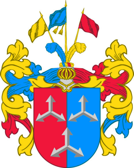 ”… Een fördeelt sköldh, den högre delen rödh och dhen vänstre blå, deruthinnan trenne footangler, två åfvan och een nedan. Ofvan opå skölden een öpen tornerehielm, täcket och crantzen medh guldt, blått och rödt fördeelte. Åfvan opå hielmen tvenne plumagier, den högre blå och vänstre guhl emellan trenne fahner, den midlerste blå, den högre guhl medh frantzar omkring och den vänstre rödh, aldeles som sielfve här hoos ståendhe vapnet medh sine egentelige färgor repræsenterat och afmålat ähr.”