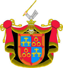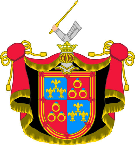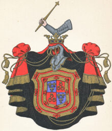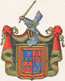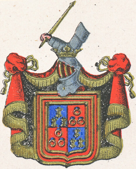 ”… de gamble Montgommeriernes Adeliga Wapn, som är en Skiöld fördelt i Fyra Fält, hwaraf dett första och fiärde är Blått med trenne Franska Lilljor af Guld besatt. Dett andra och tredie Fältet är rödt, hwarutinnann trenne Gullringar, hwardera med en Saphir infattade i triangels-vijs rangerade äro. Skiölden är omgifwen med en Bord af Guld, hwilcken är Chargerad med en dubbel röd Trescheur, fleurdeliserad af Åtta Lilljor samma färg. Ofwer Skiölden står en öppen Tornerhielm, med gyllende Crona Zirad, hwaruppå hwilar en bewäpnad Arm med en Lance af Guld i näfwen. Hielmtäcket är af Guld, Röd och Swart Färg, aldeles som detta wapn med sine egentelige färgor här bredewid afmålat finnes.”