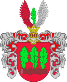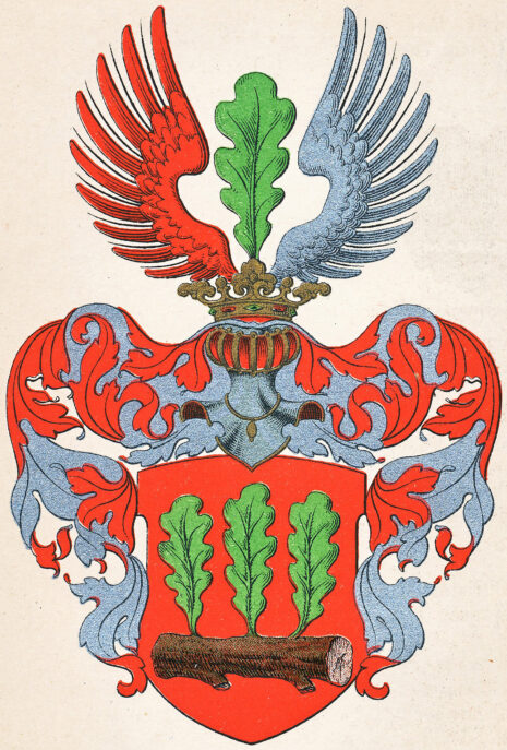 ”. . . Skölden fördhelt uti fyra fällt och mitt uti densamma dess gamble stamvapen, som är trenne gröna blad uppväxande utur een liggande stubbe uti gullfältt. . . . Öfver den medelste chronan står ett grönt blad af samma skick söm de trenne i sielfva stamvapnet emellan ett par vingar, af hvilka den högre är röd men den vänstra af silfver. . . .”