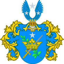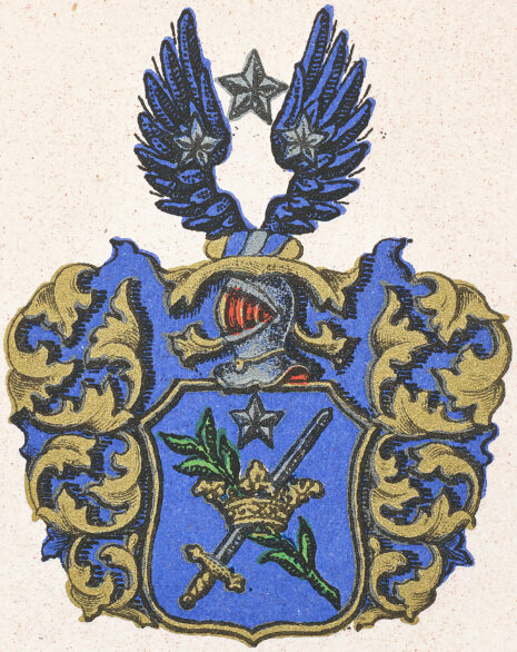 ”… En Blå Skjöld, hwaruti står en Öppen Krona af Guld, igenomstucken korszwis med ett Tweäggadt Swärd, Fästet af Guld, och Klingan af Silfwer, samt en Grön Lagerqwist: Öfwer wer hwilcket alt i Skjölden synes en Femuddig Stjerna af Silfwer. Ofwanpå är en Öpen Tornere hielm, utur hwilcken Twänne Blå Wingar upsträckas, som hafwa på sig hwardera en Femuddig Stjerna af Silfwer, och emellan Dem öfwerst sitter en Dubbelt större Femuddig Stjerna, äfwen af Silfwer. På Hielmen är en wriden Krants och omkring Skiölden Löfwärck, altsammans af Guld och Blått. Aldeles som det här ofwan med sine Rätta och egenteliga Färgor afmålat finnes.”