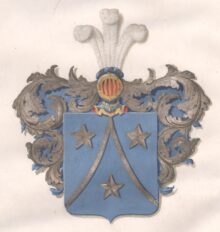 ”… En blå Skjöld, genom en smal Sparre af Silfwer med inböjda sidor, delad i trenne delar, i hwardrera af hwilka ses en Femuddig och med ena spetsen upåt wänd tindrande Stjerna af silfwer. Uppå Skjölden står en Öppen TornerHjelm, ur hwars af silfwer och blått sammanflätade Hjelmkrants upstiga Trenne hwita Struss-fjädrar. Skjölden omgifwes af Löfwärk, utantill af Silfwer, innantill Blått, alldeles som det här med sina rätta och egenteliga färgor afmåladt finnes.”