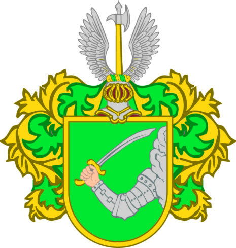 ”… En Grön Skiöld, omgifwen af en smal Gyllende Bordure eller kantning. Uti Skiölden ses en ifrån wänstra sidan till höger utsträckt Stålklädd Arm, kommande utur en Molnsky af Silfwer och hållande en Sabel af Silfwer med Gyllende Fäste. Uppå Skiölden är en öppen Tornere Hjelm, hwarutur uppstiger till hälften en till wänster wänd Strids Yxa af Silfwer med Gyllende Skaft, imellan Twänne utslagne Wingar af Silfwer. Hjelmkrantsen är wriden af guld och grönt, och Löfwärket är i dagen af Guld och i grunden Grönt. Aldeles som detta Wapen med sina rätta Färgor härhos afmåladt finnes.”