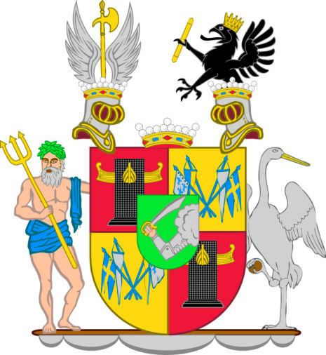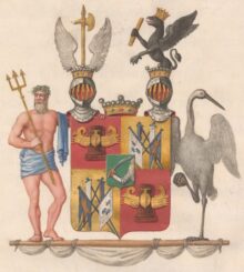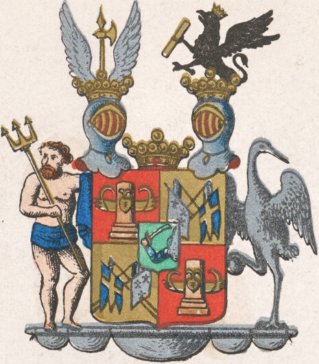 ”… En klufwen och twerdelad Sköld, midtpå belagd med Ättens adliga Wapen: en grön Sköld, hwaruti från en sky wid desz wenstra sida framräcker sig en bewäpnad arm, hållande i handen ett draget huggande Swärd med gyllene fäste. I hwardera af Friherrliga Sköldens öfra högra och nedra wenstra fält, som äro röda, ses en Colonne Rostrale af mörk Porfyr, prydd med trenne på densamma i bredd så ställda antika Skeppsstäf, att ett synes midt frammanföre och ett åt hwardera sidan. Högra nedra och öfra wenstra fälten äro af guld och i hwardera en Swensk Örlogs-Flagg och Wimpel samt en hwit Flagg med tre blå Franska Liljor midtpå och en hwit Wimpel, förenade i kors i form af Trophéer och så satte, att i högra nedra fältet äro Swenska Flaggan och hwita Wimpeln, men i wenstra öfra fältet Swenska Wimpeln och hwita Flaggan till höger. På Skölden står en Friherrlig Krona emellan twenne med dylika kronor betäckta öppna Tornerhjelmar, af hwilka den högra bär en upprättställd gyllene Stridsyxa med till wenster wändt yxblad emellan twenne åt hwar sin sida fläktande hwita Örnwingar. Ur wenstra Hjelmkronan uppreser sig till hälften en swart till höger wänd Grip, på hufwudet bärande Hertiglig Krona och hållande i högra ramen en gyllene Commando-staf. Skölden hålles på högra sidan af Neptunus, wid midjan omlindad med ett blått skärp och i högra handen förande sin gyllene Treudd; å wenstra sidan om Skölden står waksamhetens Symbole: en Trana, hållande i högra foten en sten och lyftande sina wingar, med utåt wändt hufwud: begge ställde på en Stormärs-rå med uppgigadt segel; Alldeles såsom Wapnet här ofwan med sina egentliga färger afmåladt finnes.”