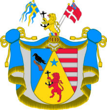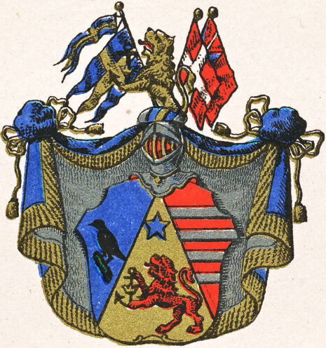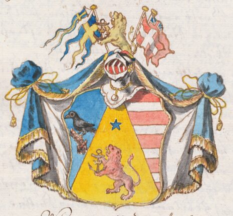 ”. . . En medelst en rätt upstående spets skuren skjöld, på sielfva spetsen, som är af guld, står ett till höger sig vändande uprest rödt lejon, hållandes emellan ramarne ett svart anckar med en gyllene crona omläggen, fölgd öfvergående med en femuddig stjerna af blå färg. I det högre fäldtet, som är slätt /blått/, synes en åt höger sig vändande svart korp, hvilande på en brun stubbe. Det vänstra fäldtet är rödt, öfverlagt med fyra silfver bjelkar. Åfvan på skjölden står en öppen torner hjelm, zirad med en af guld, blådt, silfver och rödt vriden hjelm crants, hvarutur upstiger till hälften ett dylikt lejon, som förut i vapnet nämdt är, sido satt till höger med en blå och gul svensk cron flagg med vimpel öfver och tull vänster en röd med vitt korss malthesisk flagg, fölgd baktill med en röd engelsk. Hjelmtäcket är blått, fodrat med silfver, kantat och upbundit med guldfrantsar och snören. Aldeles som det samma med sina rätta och egenteliga färgor här afmålat finnes. . . .”