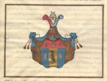 ”… En twå gånger klufwen Skiöld, hwaraf Trenne lika breda Fält upkomma, af hwilka det Medlersta af Guld föreställer en emot höger stående Falck, med sin Naturliga Färg och Rödt fladdrande band om halsen. De andre bägge Fälten til Höger och Wänster äro Blå, och i hwardera af Dem ses en uprest Billette af Silfwer. Ofwan i Skiölden ses en röd Chef, och mitt på den samma lyser en Femuddig Stierna af Guld, beledsagad på bägge sidor af en Fransk Lilja af Silfwer. Ofwan uppå ses en öpen Tornerehielm, och derutur emellan twänne Strutsfiädrar, den til Höger Blå, och den andre til Wenster röd, upwäxa Twänne grönskande Lager Grenar, som wefwa sig tilsammans til en Krants och omgifwa ett, något litet utbögdt Korsz af Guld. Krantsen är wriden af Guld och Blått, och Wapentäcket är blått underfordradt af Guld, samt Zirat och upbundit med Gyldene fransar och Snören. Aldeles som detta Wapn med sine egentelige färgor här afmålat finnes.”