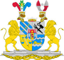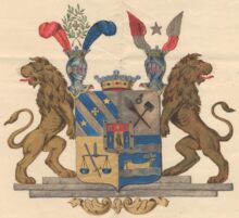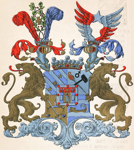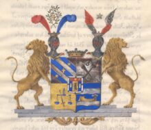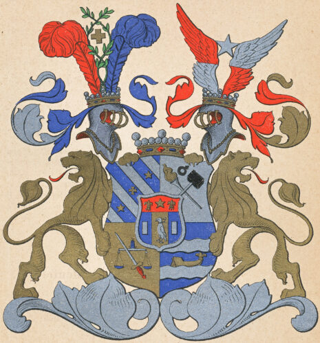 ”… En fyrdelad Sköld, belagd med en hjertSköld. Första Fältet, som är blått, är balkevis styckadt med fyra silfver bander, emellan hvilka, från vänster upåt och nedåt till höger, visa sig tvänne femuddiga stjernor af guld och medlerst ett gyllene korss. Uti andra fältet af silfver, synas i korss lagde, ett brinnande bloss och en bergsmans slägga i naturliga färger, samt derofvanför ett Bruks-märke, likaledes i naturlig jern-färg. Tredje Fältet är af gull, och deruti visa sig en jemnt hängande Wåg-balans, af blå färg, hvaröfver är lagdt ett emellan Wåg-skålarne nederst från venster och upåt till höger snedt lutande blottadt Swärd, med gyllene fäste och klinga af silfver. I Fjerde Fältet, som är blått, synes tvänne bjelke-vis flytande Strömmar af silfver, af hvilka, uppå den nedersta, synes en antik gyllene Båt, åt venster vänd, på framstammen beprydd med en fjäderbuske af silfver. HjertSkölden omgifves af en silfverkant, belagd med Åtta röda kulor eller naglar, så ställde, att trenne äro i rad öfverst och nederst, samt en på hvardera sidan af kanten. Sjelfva Skölden är twå gånger klufven, hvaraf trenne lika breda fält upkomma, af hvilka det medlersta, af guld, föreställer en mot höger stående Falk, med sin naturliga färg och rödflammande band om halsen. De andra bägge fälten, till höger och venster, äro blå, och i hvardera af dem ses en uprest billet af silfver. Ofvantill ses en röd Chef, och midt uppå densamma lyser en fem-uddig stjerna af guld, beledsagad på bägge sidor af en Fransk Lillja af silfver. Ofvanpå Skölden synes tvänne öpna Torner-hjelmar, med Friherrliga kronor prydde, och emellan hjelmarne är likaledes en Friherrlig krona. Utur högra hjelmen, emellan tvänne Strussfjädrar, den till höger röd och den till venster blå, upväxa tvänne grönskande Lagerqvistar, som vefva sig tillsammans till en krans, och omgifva ett korss af guld. Wenstra hjelmen prydes af två utslagna Wingar, af hvilka den högras nedra hälft är af silfver och den öfra röd, samt den venstra af samma färger i omvänd ordning. Emellan vingarne glindrar en femuddig stjerna af silfver. Skölden, som hvilar på en fotställning af sten, med underst anbragte sirater af guld, uppehålles af tvänne Lejon af guld, med tillbaka-wända hufvuden. Alldeles som detta Wapen med sina rätta och egentliga Färger här frammanföre afmåladt finnes.”