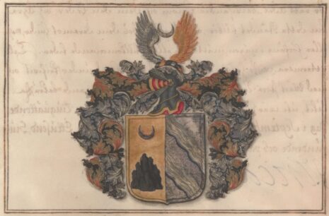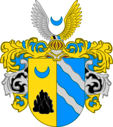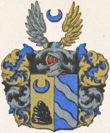 ”… En Skiöld i längden fördelt i twänne lika Delar, warandes det högre Fältet af Guld, hwaruti sees en blå tilltagande Måna ofwanför ett swart Berg. Uti det wänstra Fältet, som är blått, flyta twänne bandewis stälte Strömmar af Silfwer. Ofwan på Skiölden står en öpen Tornerhielm, öfwer hwilken wisar sig en blå tilltagande Måne, emellan twänne utslagna Wingar, hwaraf den högre är af Silfwer och den wänstre af Guld. Crantzen och Löfwerket är af Guld, Silfwer, blått och swart, aldeles som detta Wapnet med sina rätta och egenteliga Färgor här nedanföre afmålat finnes.”