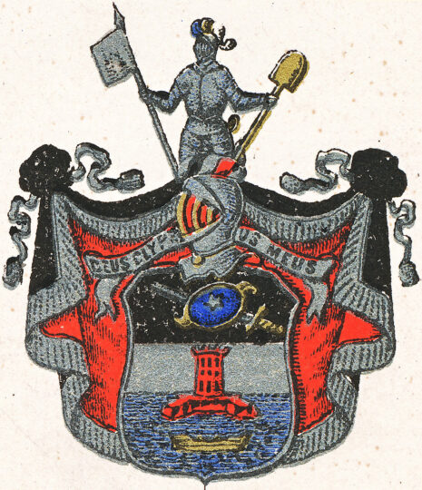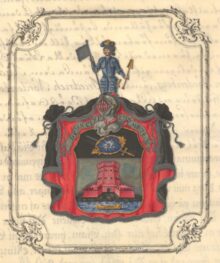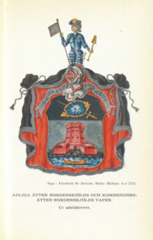 ”… En Sköld af Silfwer, hwarutinnan uppå en Swart Bergs-Fot är uppmurad en Röd Skants, hwars bägge Bastioner å ymse sidor synes med en Sexkantig Borg mitt uti af Twänne Stycke omgångar, alla Swarta, Zinkorne på hörnen satte: Bergs-foten sköljes af en förbirinnande Blå Ström, hwarutinnan en Gyllene Båt flyter; åfwanföre är en Swart Chef eller Gen-Stam, hwaröfwer ett Swärd Bande-wis lagt är, Fästet af Guld innåt wändt, Klingan af Silfwer, öfwerlagd af en Blå Sköld, som med Guld-list omgifwen är, hwarutinnan en Femuddig Strålande Nordstierna af Silfwer glindrar: åfwan på Skölden står en öppen Torner-hielm med en af Silfwer Swart och Röd wriden Hielm-krants zirad: hwaruppå öfwerdelen af en i Blått Harnesk bewäpnad man uppå knän hwilar, Hielmen af Silfwer, prydd med en Guld Stussfiäder, imellan en dylik Blå på Höger och Swart ned åt Wänster: hållandes uti den högra handen en uppå hielmen stäld Silfwer-Quarters-Flagga; men uti den wänstra en upplyft Guld-Spade, bladet uppåt wändt. Hielm-Täcket är Swart, fodrat med rödt, kantadt och uppbundit med Silfwer Frantsar Tåffsade Snören: öfwer Skölden bakom hielmen fladrar ett Silfwer-Band, hwaruti Wal-Språket, DEUS CLYPEUS MEUS, med Swarta Bokstäfwer är skrifwit; Aldeles som detta wapn med sine färgor här hos afmålat finnes.”