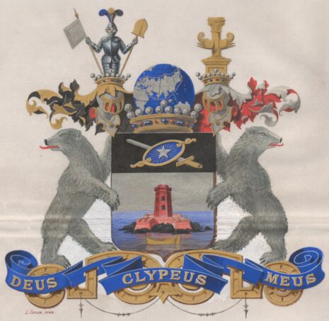 ”… En fransk sköld innehållande slägtens stamvapen, ”som utgöres af en i silfverfält, på en svart klippa stående röd skans, hvars begge bastioner synas å ömse sidor om en sexkantig krenelerad borg försedd med tvenne rader svarta styckegluggar. Bergsfoten sköljes af en rinnande ström hvaruti flyter en gyllene båt. Ofvanför är en svart chef eller ginstam, i hvilken bandevis ligger ett svärd, så att det gyllene fästet vändes nedåt och klingan som är af silfver uppåt. Svärdet är korsvis öfverlagdt af en guldkantad blå romersk sköld i hvilken en strålande nordstjerna af silfver glindrar.” Ofvanpå skölden hvilar den friherrliga kronan mellan tvenne öppna tornerhjelmar af stål med gyllene byglar, kant, smycke och kedja, hvar och en krönt med en friherre krona. Å den högra hjelmkronan synes slägtens adliga hjelmprydnad, en på sina knän stående i blått harnesk beväpnad man, med hjelm af silfver prydd med en strutsfjäder af guld, mellan till höger en blå och till venster en nedhängande svart dylik. Mannen håller i högra handen en på hjelmen ställd qvartersflagga af silfver och i den venstra en uppvänd spade af guld, likaledes ställd på hjelmen. Å den venstra hjelmkronan synes till minne af nordost passagens upptäckande en så kallad ”Columna Navalis” af guld, eller en pelare som af Romarne restes, vid en sjöfarares återkomst då han uträttat något stordåd. Den högra hjelmens löfverk är svart och guld samt den venstras rödt och silfver. Bakom den stora friherre kronan uppskjuter ofvan skölden, likaledes till minne af denna upptäcktsfärd en jordglob hvarå synas Europas och Asiens kontinenter af silfver samt å det blåa hafvet med guld markerad den väg som af Vega tillryggalades. Skölden hvilar på en gyllene fotställning i hvilken finnes instucket ett blått band, bärande i gyllene bokstäfver slägtens valspråk, ”Deus clypeus meus” och stödes af tvenne utåtseende isbjörnar af silver.”