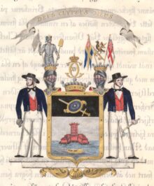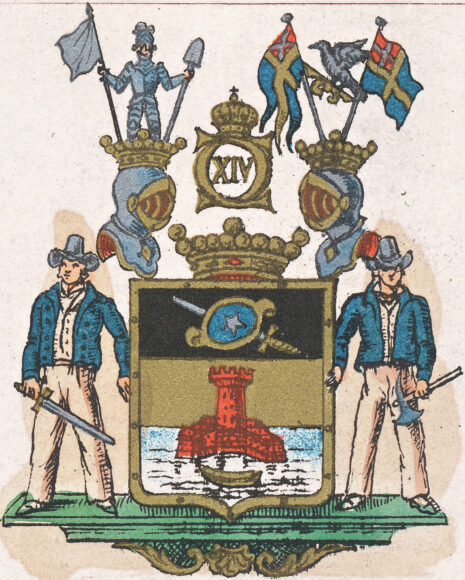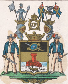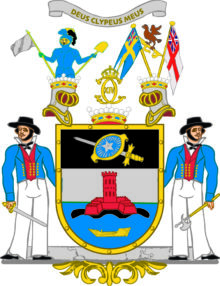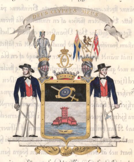 ”… En med gyllene kant, beslagen med tretton gyllene nitnaglar, omgifwen Sköld af silfwer hvarutinnan uppå en svart bergsfot är upmurad en röd Skans, hvars begge bastioner å ömse sidor synas, med en sexkantig borg midt uti af twänne stycke-omgångar, alla swarta; Brinkorne på hörnen satte: Bergsfoten sköljes af en rinnande blå ström, hvaruti flyter en gyllene Båt. Ofvanföre är en svart Chef eller ginstam, hvaröfver ett Svärd bande-vis lagdt är, fästet af guld inåt wändt, klingan af silfver, öfverlagd af en blå sköld, som med guld-list omgifves, deruti en femuddig strålande Nordstjerna af silfver glindrar. Ofvanpå skölden står en Friherrlig gyllene krona emellan tvänne öppna Tornerhjelmar, likaledes med Friherrliga kronor prydda. På högra hjelmen synes öfverdelen af en i blått harnesk beväpnad Man, hvilande uppå knän, hjelmen af silfwer, prydd med en guld strutsfjäder, emellan en dylik blå på höger, och svart ned åt wenster, hållandes uti den högra handen en uppå hjelmen ställd silfver Qvarters flagga, men uti den wenstra en uplyft guld Spade, bladet uppåt wändt. Från wenstra hjelmen utgå tvänne på gyllene stänger utåt svajande flaggor, warandes den högra den Kong.l. Svenska och Norska Örlogs flaggan, samt den åt venster, den Kong.l. Stor Britaniska flaggan; emellan hvilka synes en uppåt mot höger och nedåt till wenster snedt liggande och på längden halft delad gyllene lilja, med bladen nedåt wände, uppå hvilken står en Hök, med hufvudet åt höger wändt, och med utslagna wingar, i naturlig färg. Den medlersta Friherrliga kronan prydes af Hans Maj:t Konung Carl XIV Johans höga Namn Chiffer af guld, betäckt med en gyllene Kong.l. Krona. Skölden hvilar på en fotställning af hvit Marmor, nederst sirad med ett gyllene ornament samt uppehålles af tvänne Matroser, en på hvardera sidan; af hvilka den åt höger bär en nedåt wänd Huggare, och den wenstra en likaledes nedåt lutad Änterbila, i naturliga färger. Öfwer skölden ofvanför hjelmarne fladdrar en Silfver-Band, hvaruti Valspråket: Deus clypeus meus är skrifvet. Alldeles som Wapnet här med sina rätta och egentliga färger afmåladt finnes.”