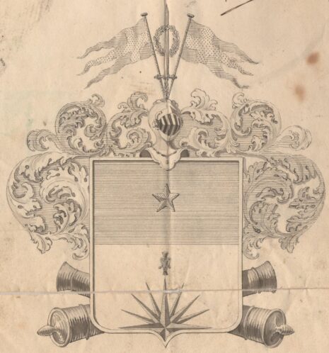 ”… En delad Sköld, i hwars Öfra Fält, som är blått, glindrar en Femuddig gyldene Stjerna; I det nedra Fältet, som är af Silfwer, föreställes öfra hälften af en Compass, med dess uppåt wände Nordwisande Wase, hwilken så wäl som strecken äro till färgen blå. Den öfwer Skölden stående, Öppna Torner Hjelmen är betäckt med en af Silfwer och blått wriden Hjelmkrans, hwaröfwer upprätt står ett med udden upwändt swärd, försedt med Gyldene fäste och behängt med en grönskande Lagerkrans samt omgifwit af Twänne wajande Swenska Örlogs Flaggor med gyldene Flagg stänger. Det så kallade Löfwärket, som endast sträcker sig ifrån Hjelmen till mitteln af Skölden, är utwändigt af Silfwer och inwändigt blått, hwaremot nedra delen af Skölden hwilar på twänne i korss lagde Jern-Canoner, hwilkas Kamrar och mynningar framsticka å ömse sidor om Skölden. Aldeles såsom detta Wapen med sina rätta och egenteliga färgor här afmåladt finnes.”