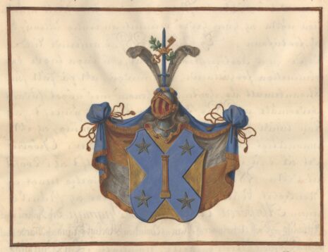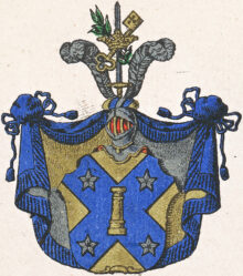 ”… En Gyllende Skiöld, belagd alt in till Hörnen med ett blått S:t Andreæ Kors, som innehafwer en bredd swarande emot en Trediedel af Skiöldens Högd. Uti Hiertat af Korset står en uprätt stälder Stolpe af Guld, beledsagad af Fyra Lysande Fem Uddige Stiernor af Silfwer, stäldte en på hwardera ändan af Korszet. Utur den öpna TornereHielmen upstiger emellan Twenne Hwita eller försilfrade StruszFiädrar ett Twehandat blått Swärd, som mitt uppå Klingan är omgifwit af en Gyllende Crona, Hwarigenom Korswis äro stuckne en nyckel af Guld, och en grönskande Lagergren. Krantsen är blandad af Guld och blått och Wapentäcket är till yttra sidan blått, men till den Inra wäxelwis fodrat med Guld och Silfwer. Aldeles som det samma med sina rätta och egenteliga Färgor härhos afmålat finnes.”