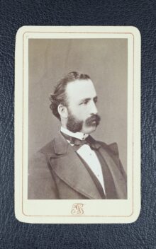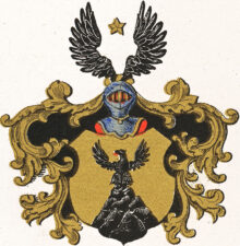 ”. . . En med afskurne öfre horn, inböjde sidokanter och förlängd nedre spets upprättstående sköld af guld, hvarå synes ett frän foten till hälften af sköldens höjd uppstigande, uppåt aftagande berg i mörk naturlig färg, å hvars öfversta del, som är tvärt afhuggen, synes stående en svart örn med utspände vingar, till höger vändt hufvud och utsträckt röd tunga. På skölden är ställd en öppen, med treradigt galler försedd adlig tornérhjelm, som är till det yttre af stål med naturlig färg och till det inre röd samt har hjelmnaglar och nedre kant af guld. Omkring dess hals synes en riddarkedja med dervid fästadt smycke, allt af guld. På hjelmen är lagd en af guld och svart virad hjelmkrans, hvarifrån uppskjuta tvänne utåt spände svarta vingar, emellan hvilkas spetsar lyser en femuddig stjerna af guld. Ifrån hjelmen utgår löfverket, som slutande sig nedåt sköldens begge sidokanter, är till det inre svart men till det yttre af guld, alldeles som sköldemärket med sina rätta och egentliga färger här afmåladt finnes. . . .”