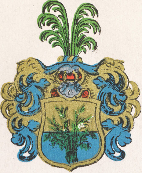 ..En fördeelt Sköldh, hallft medh blåå och hallft medh gåål färga, där vthj Sex Ollieqwistar, där ofwan oppå een öpen Tornerehiellm, öffuerst Sex PallmQuistar, effter som thet här hoos affmåhlat står….