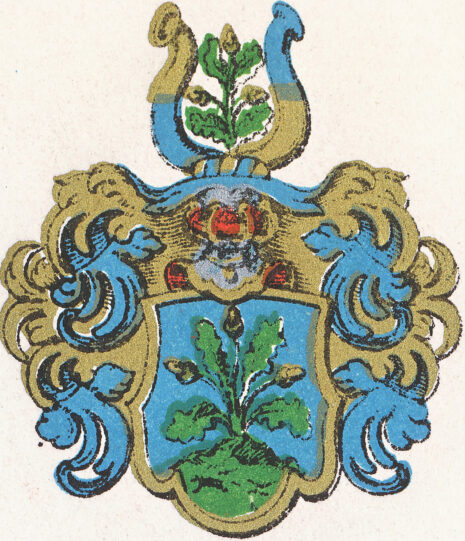 …en Blåå Sköldh, der Vthj ett grönt Bärg och der ofwan opå trenne wäxande Ållon;Ofwan opå Skölden en öpen Tornerehiälm, Crantzen och hiälmtäcket medh Blått och guulte fördeelte; Och ofwan opå Hiälmen tree wäxande Ållon emillan twenne Boffelhorn, af huilcke det högras nederdeel är guul, men öfre delen Blåå, och det Wänstre nedan Blått och guult; Aldeles som sielfwe Wapnet här mitt opå medh sine egentlige färgor reprásenterar och affmålat ståår;…