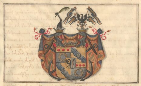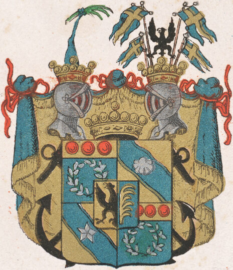 ”… En Skiöld fördelt i fyra Fält och mit uppå Fördelningen des förre adelige Stam-Wapn, som är en i längden fördelt Skiöld, warandes des högre Fält af Gull med en half swart Örn uti, och uti det wänstra Fältet som är blått, ses en förgylt Palmqwist: Men af sielfwa Friherrliga Wapnet är det första Fältet blått med en gyllende Crantz uti, och öfwerst i Fältet är en chef af Gull Zirad med tre röda Kulor. Det andra Faltet är af Gull, i hwilket flyter en bandewis stält blå Ström, och mit uppå Strömmen sees en Muszla af Silfwer. Det tredie Fältet är likt med det andra, allenast att en Stierna af Silfwer lyser på Strömmen i stället för Muszlan. Det fiärde Fältet är uti alt likt med det första. Ofwan på Skiölden stå twänne öpna Tornerhielmar med en Friherrlig Crona emellan, och en på hwardera Hielmen. Utur den högra Hielm Cronan sträcker sig en swart Örnfot, som håller med Klona en grön Palmqwist: men på den wänstra är en swart Örn med utslagna Wingar och utsträckta been, emellan twänne Flöglar och så många Wimplar. Bak om hela Skiölden äre twänne korszwis stälte Ankare, hwars fyra ändar sees å Kanterne af Wapnet. Hielmtäcket är af Gull och blått, aldeles som det här hoos stående Wapnet med des rätta och egenteliga Färgor finnes wara afmålat och utsat.”