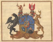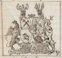 ”… En genom ett Silfwer Korsz Fyrdelad Skiöld, mitt på belagd med förra Adeliga Stamvapnet En rund ginstyckad Skjöld, omgifwen med en Borde som skiftar till Hälften Guld och Rödt, i hwars öfra Fält som är blått, synes en gyllende Örn med utslagne Wingar, hållande i Högra Klon en Skjöld; och i det Nedra Fältet af Guld, ses en blå Löth, med Twenne Ekar. Af sielfwa Friherre Wapnet är det öfra Högra Fältet Blått, hwaruti Twenne Romerske Fasces Korszwis stäldte äro. Uti det Wänstra likaledes blått synas en Wärja och en Sabel, äfwen i Korsz stälde. Uti det Undra Högra Fältet, som är af Guld, wisar sig en blå Mörsare, Bandewis stäld: Och uti det Wänstra, synes en Silfwer-Mantelskuren Spets i blått Fält: Från Spetsens Nedra del wisar sig ett Swart brinnande Berg, och i det Blå Fäldtet på ömse sidor om Spetsen äro Twenne Signa Martis Barrewis lagde. Uppå Skjölden ses Twenne Öpna Tonere Hjelmar, Krönte med Friherre Cronor, och emellan dem en större Friherre Crona. Utur den Högra Hjelm Cronan upstiger till Hälften emellan 2ne Hwita Estandarer, ett åt Höger sig wändande Gyllende Leijon, hållande i Högra Ramen en Öppen Crona. Uppå den Wänstra Hjelm Cronan, stå Twenne utslagne Röda Wingar, begge mitt på belagde med en Sju Uddig Chymisk Stjerna af Silfwer, och emellan dem en Uprest Swart Bergsfackla. Hjelmtäcklen är af Guld, blått Silfwer och Rödt. Skjöldhållare äro till Höger en Swart Grip med utslagna Wingar, och till Wänster en Elg af Naturlig Färg, begge tilbaka seende; stående liksom Skjölden på en decorerad Pied’d’Estal. Aldeles som det samma Här frammanföre med sina rätta Färgor afmålat finnes.”