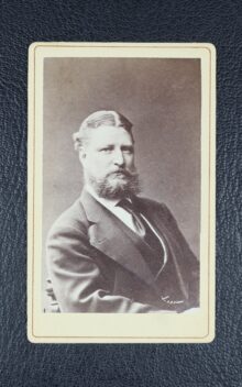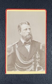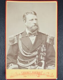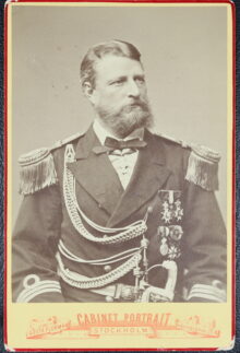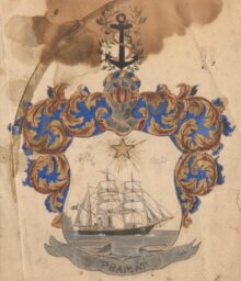 ”… En Fransysk, rätt uppstående sköld, vågrätt styckad af en skura så, att det öfre egentliga fältet är azur och det nedre såsom stam eller sköldfot har den naturliga färgen af vatten, hvari synes ett barktackladt svart ångskepp för fulla segel och hissad treklufven Svensk flagg samt standert å stormasttoppen med god fart gå fram åt öster, lemnande akterut ett högt isberg, samt förbigående flera vid sidan brutna isstycken. Öfverst i azurfältet strålar en femuddig stjerna af guld. På skölden är stäld en tregallrad öppen tornerhjelm, till det inre klädt i rödt och till det yttre af stål i naturlig färg med nedomkring en skoning af guld. Omkring hjelmens hals synes en gyllene riddarkedja jemte dervid fästadt smycke af guld. På hjelmen är lagd en af guld och blått virad hjelmkrans, från hvilken uppskjuta tvenne lagerqvistar, som korsande omsluta ett å hjelmkransen stäldt svart skeppsankare med dervid fästad ankartross af guld. Från hjelmen utgår, hängande nedåt Sköldens båda sidokanter, löfverket, som till det yttre är af guld och till det inre är azur. Under skölden är fästadt ett silfverband, hvarå synes valspråket: FRAMÅT.”