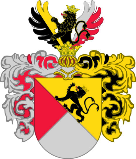 ”. . . en sköld, snedt delad i lika delar från vänstra nedre till högra öfre hörnet och den nedre hälften åter delad från högra nedre till vänstra öfre delen sålunda, att det understa af dessa fält är hvitt, det öfre till höger rödt och den andra öfre vänstra hälften helt gul eller guldfärgad, däri synes framåt riktadt, färdigt till rof, ett svart lejon med bakåt krökt svans, öppet gap och röd, utsträckt tunga; på skölden en tornerhjälm med till vänster svart och gult, till höger rödt och hvitt hjälmtäcke, ofvanpå denna en virad wulst i samma färger, med flygande band, därur två örnvingar med framåt vända ryggar uppgå, hvilka vingar i midten äro delade på tvären, öfre delen gul- eller guldfärgad, nedre delen hvit eller silfverfärgad och i midten af hvarje en röd kil, som går till midten af hvarje vinge ifrån vingarnas rygg, på följande sätt förändradt, beprydt och förbättrat: nämligen istället för den slutna hjälmen en fri och öppen, adlig tornerhjälm, som i likhet med lejonet prydes med en gyllene kunglig krona; där ofvanpå, istället för de förutvarande, två utbredda örnvingar, hvilkas ryggar vända sig inåt, och hvar och en af dessa, på längden från ofvan till nedan delade i två lika delar, så att den bakre (vänstra) är utåt röd, inåt silfverfärgad och den främre (högra) inåt guldfärgad, utåt svart; däremellan ett krönt svart lejon utan bakfötter med bakåt krökt svans, framsträckta ramar och röd utsträckt tunga – att hädanefter i evig tid föra och bruka, af nåd, och gunst och lof. Och är detta adliga vapen och hjälmprydnad med pyntning och förbättring, sålunda måladt och med färger uppritadt i midten af detta vårt kejserliga bref.”