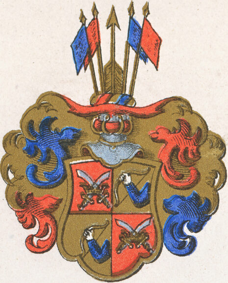 ”. . . Een fördelt sköldh, öfre dehlen pÃ¥ högre och nedre dehlen pÃ¥ vänstre sijdan är rödh, uthi hvardera tvenne sabblar korssvijs satte igenom een gyllende crona; nedre dehlen pÃ¥ högre och öfre pÃ¥ vänstre sijdan är guhl, dher uthi een uthsträckt beväpnat arm, fattandes medh handen een flittzboga; Offvan pÃ¥ skölden een öpen tornerehielm, crantzen och hiälmtäcket medh rödt, blÃ¥dt och gult fördelt, pÃ¥ hiälmen een skäckta, stÃ¥endes emillan tvenne röde och tvenne blÃ¥ standarer, aldeles som sielfve vapnet här mitt opÃ¥ med sine egäntlige färgor repræsenteradt och afmÃ¥lat stÃ¥r. . . .”