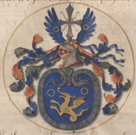 ”… Een blå Skiöld, hwarutj wijsar sig een Drake af Gull emellan twenne Ringar af samma Metall, omkring Skiölde kanten i stället för bord slingar sig een Orm af Sölfwer, som sammanspännes med een Hwijt Lillia, och på Ormen ägarens Nampn till öfwer skrift, efter det sätt som fordom har warit brukeligit; Åfwan på Skiölden står een öppen Tornerhielm, hwarutur opstijger een af Sölfwer och Gull i korβwijs fördelter blix, hwilken i Hedendommen kallades Tors Hammarmärke, emellan ett pahr blå ÖrneWingar, hwardera medh een gyllende ring Zijrade, Crantzen, ifrån hwilken slänga sig twenne blå band, sampt Löfwärket är af Gull, Sölfwer och blått aldeles som sielfwa Wapnet med sine rätta och egentelige färgor här hoos står afmåhlat, …”