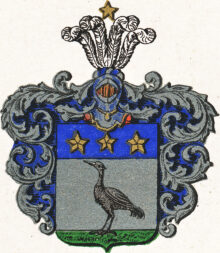 ”… En Fransk Skjöld, belagd med en blå Ginstam eller Chef, i hvilken ses trenne, i bredd ställde, femuddiga, gyllene Stjernor. I nedra fältet, som är af silfwer, står på grönskande mark en till höger wänd Häger af naturlig färg. På Skjölden hvilar en öppen Tornerhjelm, hwaruppå ses upreste fyra hvita Struss fjädrar, öfver hvilka sväfvar en gyllene femuddig Nordstjerna. Skjölden omgifves af Löfwerk, som utvändigt är af silfver, men innantill blått. Aldeles som detta Wapen med sina rätta och egenteliga Färgor här frammanföre afmåladt finnes.”