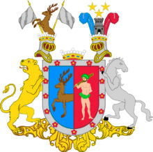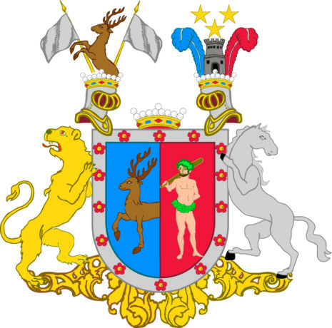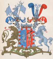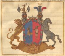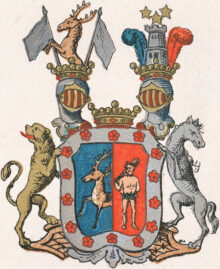 ”… En med Silfwer Borde omgifwen och en gång Klufwen Skjöld. Uti det Blå Fäldtet till Höger framkommer till Wänster hälften af en gående Naturligt målad Hjort, och uti Wänstra Fäldtet som är Rödt, står en litet emot wänster wänd Naturligt målad Wildman med Krants och Lifgjördel af gröna Ekeblad, samt en Gyllende klubba på högra Axlen. Den nämde Borden är belagd med Fjorton röda Fembladiga Rosor. Ofwan på Skjölden står en Friherrlig Crona emellan Twenne äfwen med Friherre Cronor Krönte och med Fem gyllende Byglar försedde Öpna Tornere Hjelmar. Utur den Högra Hjelm Cronan upspringer mot höger en Half naturligt Målad Hjort emellan Twenne LifFanor af Silfwer wid Gyllende stakar och uppå den wänstra Hjelm Cronan står uprest en crenelerad borg, omgifwen, öfwer hwilcken swäfwar Tre Femuddige Stjernor af Guld, åtföljande hwar annan 2 och 1. warandes bemälte borg omgifwen af Twenne Struszfjädrar den till Höger blå, den till wänster Röd. Skjöldhållare äro till Höger ett tappert sig tilbaka seende Leijon af guld, och till wänster en modig sig tilbaka seende Häst af Silfwer. Aldeles som detta Wapn med sina egenteliga Färgor här frammanföre afmålat finnes.”