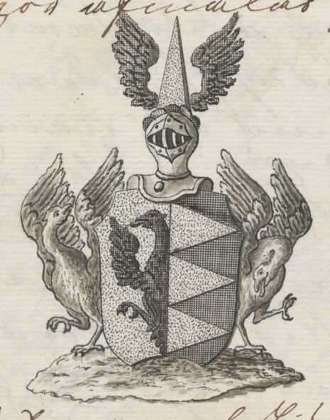 ..en fördeelt Skiöldh endalångs nederårh på högre sijdan en Swart halftflächter Örn uthi gult fäldt på Wänstre sijdan tree förgylte Vddar eller piramider uthi swart feldt. Ofwan på Skiölden är en öppen Tornerehielm, hwaruthur uppstiger en förgylt Piramide emellan twå swarte Vthflächte Örnewingar Hielmtäcket och löfwärket af guul och swart ferga medh något hwitt beblandade, aldeles som sielfwa Wapnet medh sine egentelige fergor här hoos står måhlat och afsatt…..