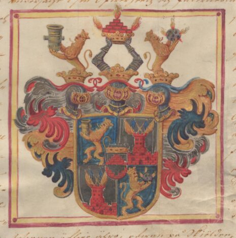”… En Sköldh i fyra fördelt, bestående af twenne leyon och twenne Murar, uthi hwardere Muren, fyra Fahnor, och gamble Wapnet mit uthi; Trenne Tornerehielmar, sådane som på frijherre Wapnen öflige ähro, ofwan på Skiölden, uthur den ene som mit uthi ståår, stijga twanne Armar opp som oppehålla en Steengafwel medh tree der uthur upstigande eldzflammor, äfwen som uppå dhet gambla Wapnet och uthur den högre ett Leyon oprättstående, hållandes medh begge Kloarne een fyrmysa , och uthur den Wänstre ett lijka leyon, hållandes en Kuhla i den högre fothen, aldeles som Wapnet ståår här afmåhlat.”