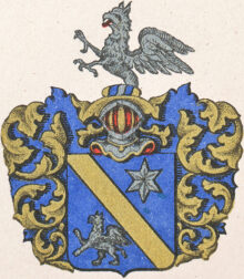”. . . En blå sköld, hwaröfwer en Guld Staaf Bande wijs ligger, sidosatt en chef af en Sexuddig Silfwer Stierna och inunder wisar sig en uprest Silfwer grip. Ofwanpå skiölden står en öpen Tornerhielm, hwarutur upstiger öfwerdelen af en Silfwer Grip. Hielm-Krantzen och Löfwerket är af Silfwer och blått aldeles som detta wapnet med sina rätta och egenteliga färgor herhos afmålat står.”