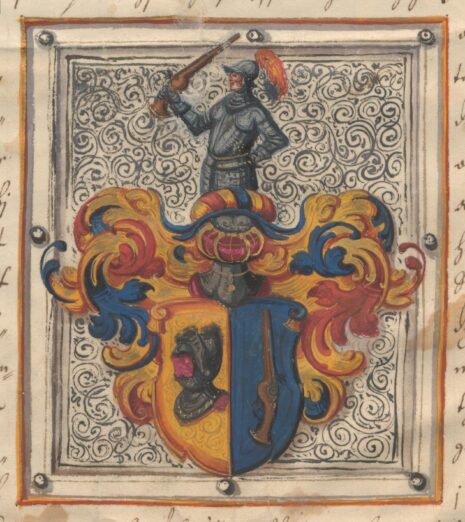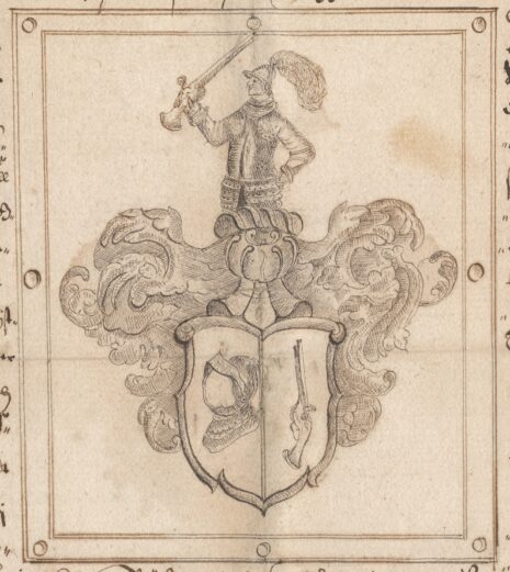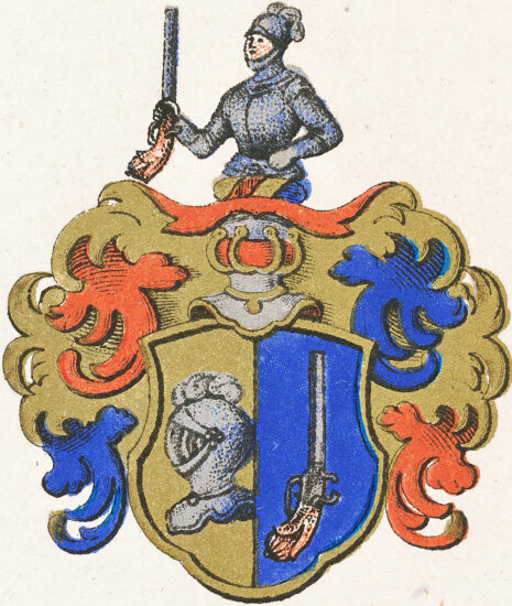 …Een fördeelt Sköldh, uthj huilckens högre deel står een Hielm eller harnisk uthj guhlt, och j den wänstre, een sprächt Pistol uthj blådt feldt; Ofuan opå Skölden een äpen Tornerehielm, Täcket och Crantzen medh blådt, guhlt och rödt fördeelte; Och Ofuan opå Hielmen een half bewäpnadt Man, hollandes j högre handen een Pistol, aldeles som det medh sine Egendtlige färgor härhoos afmåhlat och repræsenteradt står;….