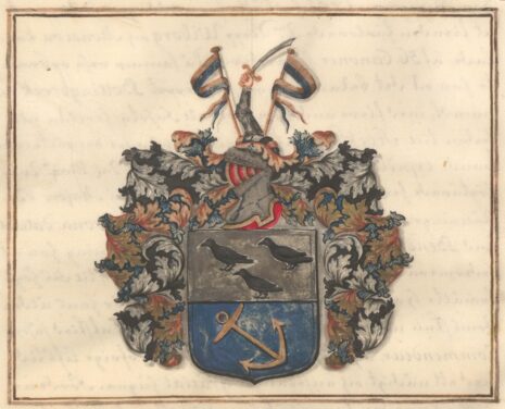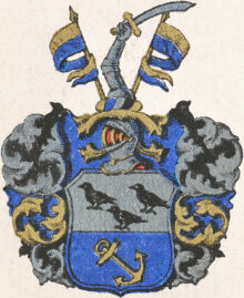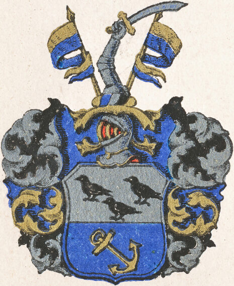 ”… En Skiöld i Twäran fördeeld i twänne lijka deelar; det öfre Fältet är af Silfwer, hwaruti stå tre swarta Korpar, twå stälte öfwer den tredie; det nedre Fältet är blått, i hwilcket wijsar sig ett bandewijs stält Anckar af gull. Ofwan på Skiölden står en öppen Tornerhielm, hwarutur sträcker sig en bewäpnad arm, som håller med handen en dragen Sabel, emellan twänne Wimplar, med gull och blått i twäran fördeelte. Crantzen och Löfwärcket är af Gull, Silfwer, Blått och Swart, aldeles, som detta Wapn med sina egenteliga färgor här hos på andra sijdan afmålat finnes.”