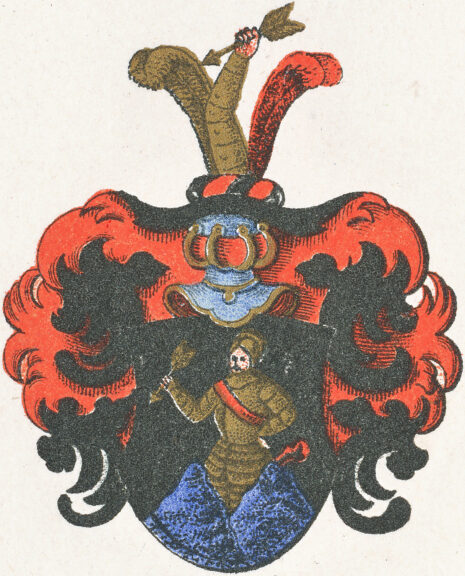 ….Een fördeelt Sköldh, deruthj står een half Man j förgyldt kyriß och swart felt hållandes j högre handen een Skäckta och opstigneedes emellan tuenne blå bärgh j. Ofuan på Skölden een öpen Tornerehielm, Täcket och Cranzen medh rödh och suart fördeelte, ofuan på hielmen en bewäpnat förgyllt Arm, hollandes j handen een Skäckta emellan tuenne guhle och rödhe Strußfiedrar aldeeles som deet medh sine egentlige färgor här hoß repræsenterat och afmåhlat ståår,…