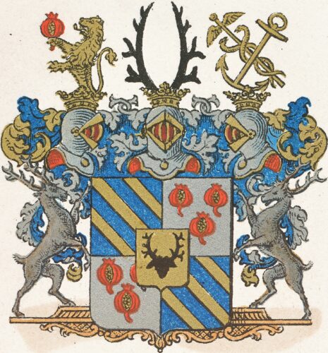 ”… Skiölden fördelt i fyra Fält, och mitt uti den samma, des, effter konsten förbättrade, Adelige Stamwapen, nemligen: En Skiöld af Gull, hwari stå ett par swarta Reenhorn på stiernan eller öfwersta delen af hufwudet; Men af sielfwa Grefwelige Wapnet är det första Fältet blått, hwar i wisa sig trenne Bander af Gull; det andra Fältet är af Silfwer och däruti 3:ne Röda Granate Äplen; det tredie Fältet är uti alt lijkt med det andra; Så och det feirde med det första; Åfwan på Skiölden stå trenne öpne Tornerhielmar, med en Greflig Crona öfwer hwardera; Utur den medlersta Hielm Cronan upstiga ett par swarta Reenhorn, och utur den högre Hielm Cronan wisar sig öfre delen af ett gyllende Leijon, hållandes ett rödt Granatäple i högre rahmen; men öfwer den wänstra Hielm Cronan äro ett Ankar och Mercurii Staf kors wijs stälte, bägge af gull; Löfwärcket är af Gull och Blått, och sielfwa Wapnet Supporteras af twenne Reenar af naturlig färg. aldeles som det här hos afmåhlat finnes; …”