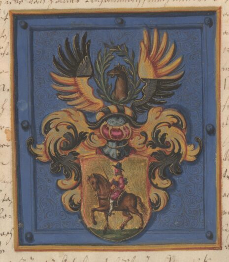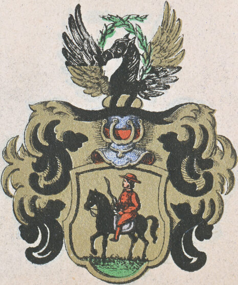 …en Guhl Sköldh, der vthi en Ryttare sittiande på en Kastaniebruun häst, ofwan på Skölden en öpen Tornerehiälm, Crantzen och hiälmtäcket, sampt Lööfwärcket medh Swart och guult fördeelt; Ofwan på Hiälmen en grön lager Krantz, der vthi ett Hästehufwudh, emillan twenne Vthsträchte Wingar, afhwilke den högres Öfre och Wänstres nedre deel är Swart, Och den Wänstres Öfre och högres nedre deel Guuhl aldeles som sielfwe Wapnet här mitt öpå med sine egäntlige färger repræsenterat och afmåhlat ståår….