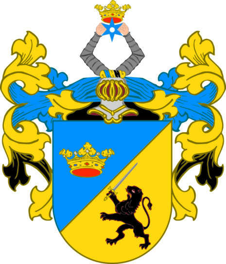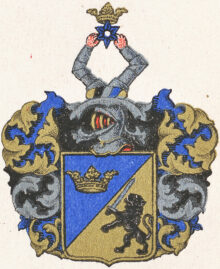”… En Skiöld, fördehlt igenom ett taillé streck i twänne lijka dehlar, warandes det öfre Fältet blått, i hwilcket wijsar sig en gyllende Crona, och det nedre af Gull, uti hwilcket står ett swart Leijon med ett blått Swärd i högre Ramen. Ofwan på Skiölden står en öppen Tornerhielm, hwarutur sträcka sig twänne bewäpnade Armar, som hålla en krönt blå Molett emellan Händren. Crantzen och Löfwärcket är af gull, blått och swart. Aldeles, som det till alla des delar här hos afmålat finnes.”