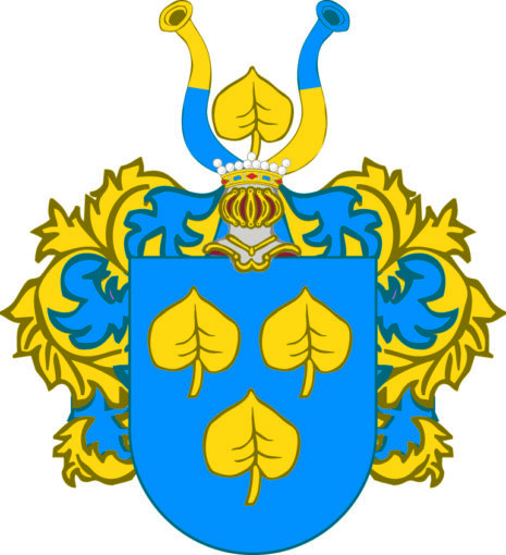 ”. . . En blå sköld med deruti 3:e upväxande gyllende lindeblad. Uppå skölden äro 3:e torner hielmar, hvardera med en gyldene grefve krona betäckt. Uppå den medlerste ses 2:e uphögde buffelhorn, vexelvis fördelte med guld och blått och emellan dem ett gyllende lindeblad. . . .”