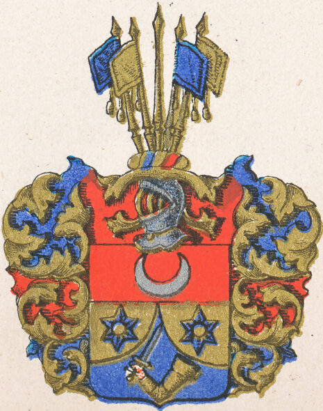 ”… Skiölden fördelt genom twänne spitzigt upgående strek uti tränne delar, warandes det medlersta fältet blått, hwaruti är en bewäpnat Arm af gull, som håller ett Swärd i handen, men de yttre fälten äro af gull, hwardera Zirade med en blå Molet; öfwerst i Skölden är en röd chef i hwilken lyser en tilltagande Måne af silfwer. Åfwan på Skölden är en öppen Tornerhielm, hwaruppå står en Lance af gull emellan fyra Estandarer af blått och gull, hwar om annan fördelte. Crantzen och Löfwärcket, är af gull, silfwer, blått och rödt; aldeles som detta Wapn med sine färgor här afmålat står.”
