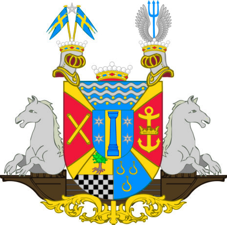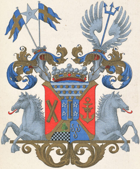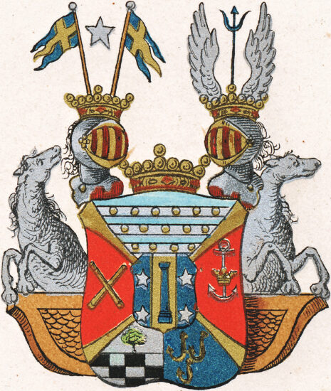 ”… En skiöld, styckad i fyra fäldt genom ett gyllende Andreæ korss och mitt uppå belagd med den förre adelige skjölden, som är på längden fördelt i tre lika delar, den medlersta af guld och deruti en uprest blå stolpe eller pelare samt i hvardera af de andra yttre fäldten, som äro blå, tvenne silfver moletter, palevis stälde. Utaf frijherre skjölden är det öfra fäldtet blådt och deruti äro trenne flytande silfverströmmar samt trenne rader gyllende kulor vexelvis lagde, varandes i första raden sex, i den andra fem och i den tredje fyra kulor. Uti andra eller fäldtet till höger, som är rödt, sees tvenne gyllende commendeurs stafvar i kors stälte, och i det tredje eller vänstra fäldtet, som likaledes är rödt, finnes et uprätt stående ankar af guld, trädt igenom en gyllende krona. Nedersta fäldtet är klufvit, högra delen innehåller hälften af det adeliga clerckiska vapnet, som är tvärdelad, öfra delen af guld och der uti en grönskande ek. Nedra delen består af fem rader svarta och silfver schackrutor. Den vänstra delen åter innehåller det adeliga gyllenkrookska vapnet, tre gyllende krokar, 2 och 1 stälte i blått fält. Uppå skiölden äro två öppna med fri herre kronor täckte tornerhielmar. På den högra stå upreste tvenne svenska kron-flaggor och der emellan en molette af silfver, och på den vänstra hjelmen sees tvenne utslagne vingar af silfver och emellan dem uprest en blå neptune gaffel. Skiölden är emellan hjelmarne betäckt af en fri herre crona och uppehälles på sidorne af 2:ne ifrån skiölden sig sträckande sjöhästar af silfver, som ligga i hvars sin, bakom skiölden framkommande galere uppå en med ornamenter prydd gyllende pied d’estal, aldeles som det samma här frammanföre med sine rätte färgår afmålat finnes. . . .”