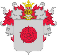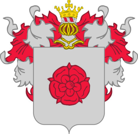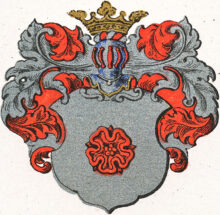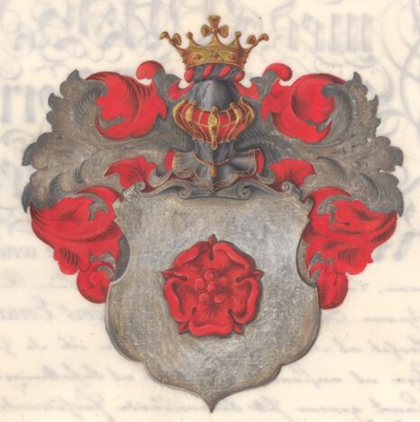 ”… En rätt uppstående fransysk sköld af silfwer, i midten af hwilken synes en röd fembladig ros. På skölden hwilar en öppen adlig tornerhjelm, hwarå ligger en af silfwer och rödt wirad hjelmkrans, hwilken såsom hjelmprydnad uppbär en Swensk adlig större krona af guld. Från hjelmen utgår, sträckande sig ned åt sköldens sidor, ett löfwerk, som är omvexlande rödt och af silfver, aldeles som sköldemärket med sina rätta och egentliga färger här afmåladt finnes.”