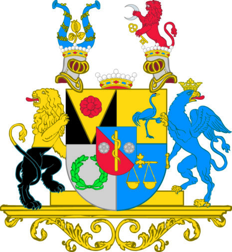 ”… En klufwen och delad Sköld, i midteln belagd med en af rödt och blått styckad Hjert Sköld, hwari wisar sig en uprest Gyllene Æsculapii Staf, beledsagad på hwardera sidan af en fembladig Ros af Silfwer. I den Friherreliga Sköldens första eller högra öfra fält, som är swart, nedlöper från båda öfra hörnen til midteln af nedra kanten en Gyllene spets, belagd med en röd fembladig ros. I det andra eller öfra wenstra Fältet, hwilket är af Gull, står en blå åt wenster wänd Trana, med den ena foten uplyftad, hwari hon håller en sten. Det tredje eller nedra högra Fältet är af silfwer, och foreställes i det samma en grön Eklöfs krans. I det fjerde eller nedra wenstra, som är blått, förekommer en Gyllene Wåg. Skölden är betäckt med en Gyllene Friherrlig Krona samt twänne på hwar sin sida stående öpna Tornere Hjelmar, med dylika kronor äfwen prydda. På den högra synes twenne i ändarne öppna blå horn, bandewis trenne gånger omwirade med en ranka af Gyllene rosor och blad, samt emellan hörnen ett gyllene Granat Äpple med sin stjelk och blad. Från den wenstra Hjelmen åter upstiger ett till höger wändt rödt Leijon, som med den högra foten håller en wäxande Måne af Silfwer och med den wenstra en Gyllene nyckel. Skölden understödes till höger af ett sig tilbaka seende Leijon, till öfra hälften af Gull och till den nedra swart, till wenster af en sig tillbaka seende blå Grip med en Gyllene krona, näbb och klor hwilka hwila på en gyllene fotställning. Aldeles som det här ofwan med sina rätta och egenteliga färgor afmåladt finnes.”