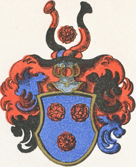 …een Himmelsblåshöldh i hwilcken står tree röda dubbla roosor, twå ofwan och een nedanföre ofwan på Skölden, een öpen Tornerhielm och ofwan på hielmen een rödh dubbel Roos emillan tu boffell Horn; thet högre hornet medh rödt och swardt, och thet wänstre medh swart och rött fördelt, Crantzen och hielmtäckedt medh blåå rödh och swart färga, aldeles som sielfwa wapnedt her mitt på medh sina rätte och egendtlige färgor. Repræsenterar och afmåhlat står…..