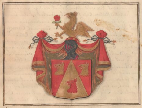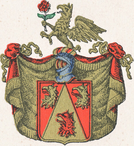 ”… En Skiöld genom twänne spitzigt upföre sammangående streek, fördelt i tre delar, warandes det medlersta Fältet af Gull, med ett Rödt Grijpehufwud uti, men uti hwardera af de bägge yttre Fälten, som äro röda, wijsar sig ett förgylt Grijpe-Hufwud. Offwan på Skiölden står en öppen TornerHielm, hwarutur sträcker sig öfre delen af en förgylter Grijp, som håller med högre kloon en röd Roos på sin Stielcke. Crantzen och Hielmtäcket är af Gull och Röd färg, aldeles som närstående med sine egentelige färgor afmålade Wapn det uthwijsar.”