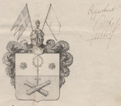 ”… En Fransk Skjöld i twänne lika delar twärt fördeld, det öfra Fältet Silfwer, det nedra Rödt, belagd med ett upprättstående Swärd af Stål, emellan twänne dubbla Röda Rosor, Spetsen omgifwes af en grön Lagercrants. Fästet, som är af Guld med wriden Kafle sträcker sig ned i det röda Fältet, och derunder ses twänne korszwis lagde Canoner af samma Metall med upåt wände Mynningar, Boureletten ofwanpå den öpna Tornerhjelmen är sammanwriden af Blått och Guld, derutur upstiger ett framseende Mennisko-Hufwud, omgifwit på Americanske sättet af en hwit Bindel, med Röda, Gröna och Blå Fjädrar besatt, samt på högra sidan derom, Kongliga Swänska Amiralitets Flaggan, och på den wänstra en hwit, eller den Kongliga Franska Flaggan; Löfwärket är Blått och Guld; Aldeles som detta Wapen med sina rätta Färgor här afmålat finnes.