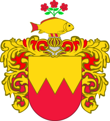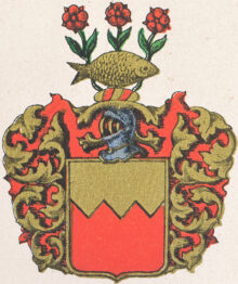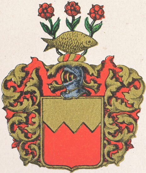 ”… En Skiöld fördelt i Twenne genom ett femuddigt streck i twänne frija fäldt, warandes det öfre fältet af Gull och det nedra rödt. Ofwan på Skiölden står en Öpen Tornerhielm, hwar öfwer Ligger en Ruda af Gull, wändandes sig åt wänster; bak om den samma wijsa sig Trenne röda Rosor uppå en grön Stielcka. Crantzen och Löfwercket är af gull och Rödt, aldeles som detta Wapen med sina egenteliga Färgor här hoos afmålat finnes.”