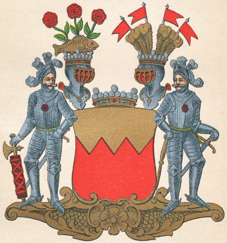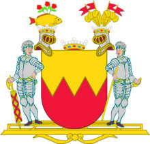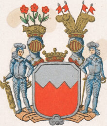 ”En skiöld, fördelt i tvären genom en sågskura af trenne nedgående uddar, varandes öfra fältet af guld och det nedra rödt. Ofvanpå skiölden sees tvenne öpna med fem böglar försedde och med friherre cronor täckte tornerehielmar samt emellan dem begge en friherre crona. Öfver den högra hielmcronan ligger en ruda af guld, vändandes sig åt vänster, och bakom densamma visa sig trenne röda rosor på hvar sin gröna tvåbladige stielke. Utur den vänstra åter upresa sig 6 stycken strussfiedrar af guld, trenne lutande åt hvarje sida, och bakom dem äro instuckne 4 röda små fahnor, hvaraf tvenne blåsa åt hvar sin sida. Skiöldhollare äro tvenne sig från skiölden vändande harneskklädde och beväpnade stridsmän med öpne af plumager prydde casquer på sina hufvuden; den högra förande i sin högra hand en fascis romana af guld med röda band omlindad, och den till vänster i sin högra hand en landtmarskalcks staf af guld, fattandes med vänstra handen i värjefästet, begge lutande sine invände armar på skiölden, samt stående likasom skiölden på en ornerad pied’d estal. . . .”