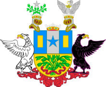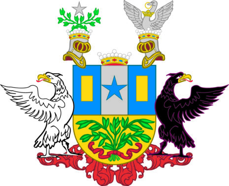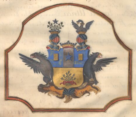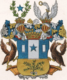 ”…, des förra Adeliga Stam-Wapn, som är en afskuren Skiöld, uti hwars öfre fält, som är Blådt, står en Silfwerstolpe, belagd med en blå Stierna, och sidosat med Twenne Guld-Billetter. Uti det nedre fältet, som är af Guld, wisa sig femb med ett Rödt band sammanbundne Gröna Lager-Qwistar. Ofwan på Skölden stå Twenne Öpne Torner-Hielmar med En Frij-Herre-Crona emellan, och en uppå hwardera hielmen. Uppå den högra Hielm Cronan glindrar en Silfwer Stierna emellan Twenne Korswis lagde gröna Lager Quistar: Utur den Wenstra Hielm-Cronan upstiger en Silfwer Swan med flyckt stälte Wingar, hwars Hals är beprydd med en Guld Crona, hållandes i Näbben en nederåt hängjande Guld Ring. Skiölden stödjes å högra sidan af en hwit, å Wenstra af En Swart sittjande Örn med utslagne Wingar, och ifrån Skiölden utåt wände Hufwuden. Aldeles som detta Wapn med des egenteliga färgor härhos afmålat finnes: …”