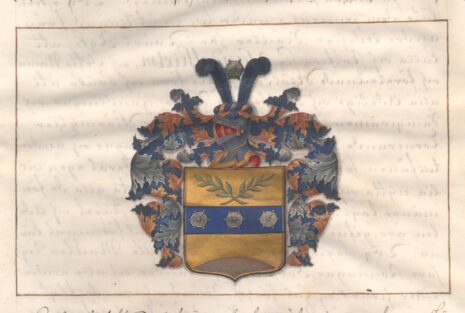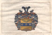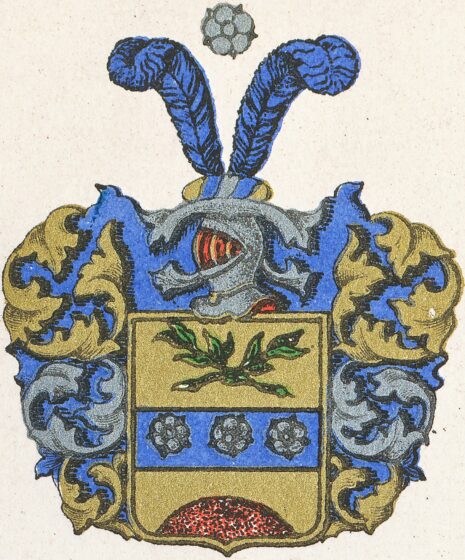 ”… En Skiöld af Gull, i hwilcken ligger en blå bielcke, Zirad med trenne Rosor af Silfwer, öfwer Bielcken äro twänne i korsz-wijs lagde Lagerqwistar, och nedan för den samma en Sandrefwel. Ofwan på Skiölden står en öpen Tornerhielm, hwaruppå är en lijka Roos som i Bielcken, emellan twänne blå Strusz-fiedrar. Crantzen och Löfwärcket är af Gull, Silfwer och Blått, aldeles som detta Wapen med sine egentelige färgor här hoos på andra sidan afmålat finnes.”